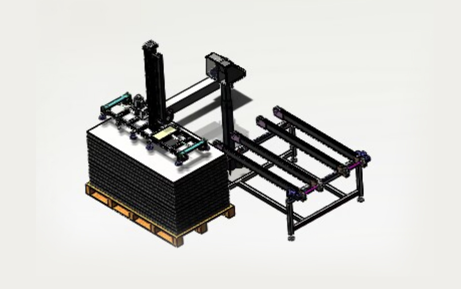 自動排版機的主要功能單元有:玻璃輸送定位系統(tǒng)、抓取行走系統(tǒng)、視覺檢測系統(tǒng)、電控系統(tǒng)等;通過以上功能單元,實現(xiàn)了將自動串焊機串焊好的電池串,按照工藝尺寸要求和排版方向順序自動排版鋪設到玻璃(EVA已經(jīng)鋪設)上,組成電池串陣列。玻璃/EVA通過傳輸線傳輸至指定位置,機械手抓取電池串實現(xiàn)CCD定位、自動旋轉、自動排版功能。設備通過同步帶傳輸與自動生產(chǎn)線對接,實現(xiàn)了自動流水作業(yè)。